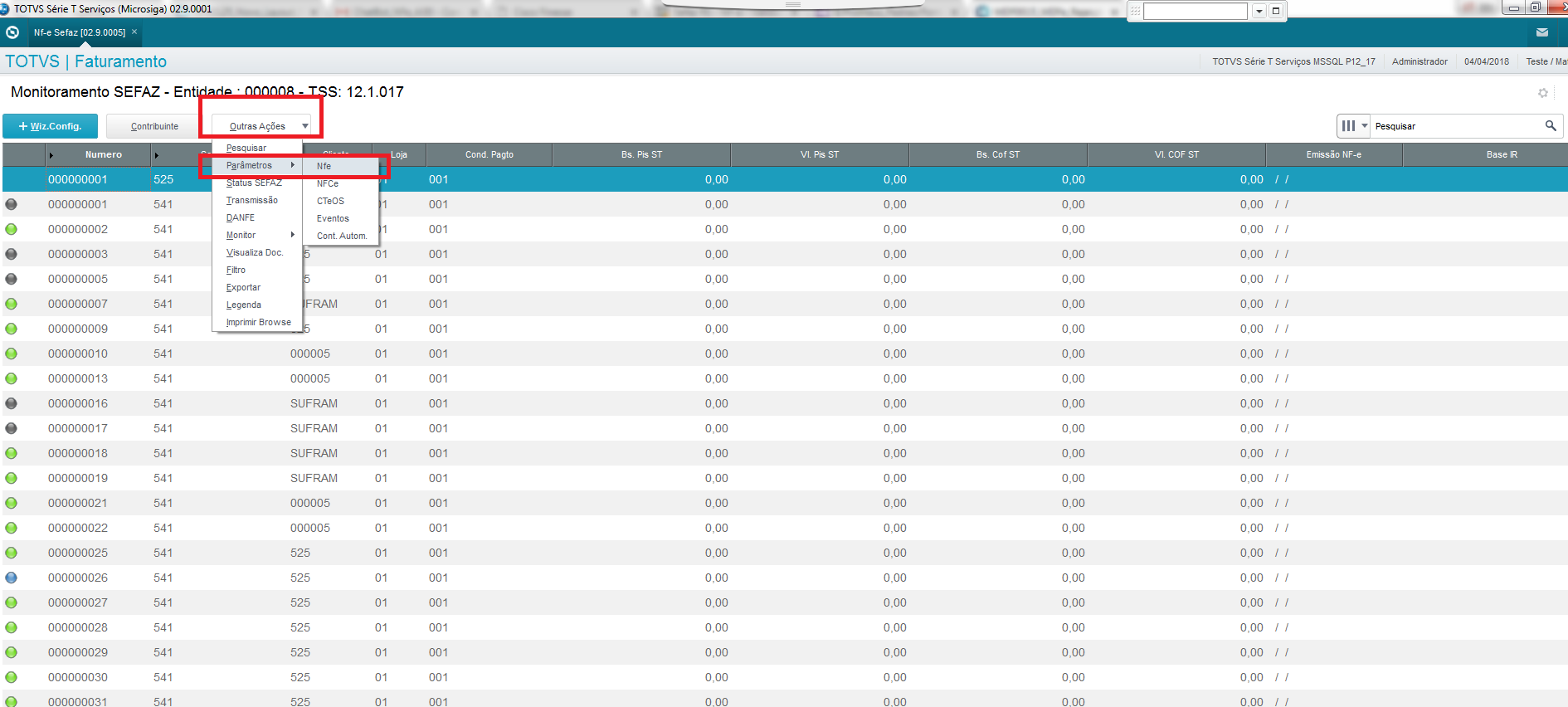 Após as atualizações devem ser configurados os parâmetros dentro da rotina SPEDNFE Outras ações → parâmetros → NFe