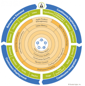 DevOps faz parte da competência de entrega de produtos ágil da empresa Lean proposta pelo Framework SAFe. DevOps é uma combinação de duas palavras: desenvolvimento e operações. Sem DevOps, há frequentemente uma tensão significativa entre aqueles que constroem soluções e aqueles que as suportam e mantêm.